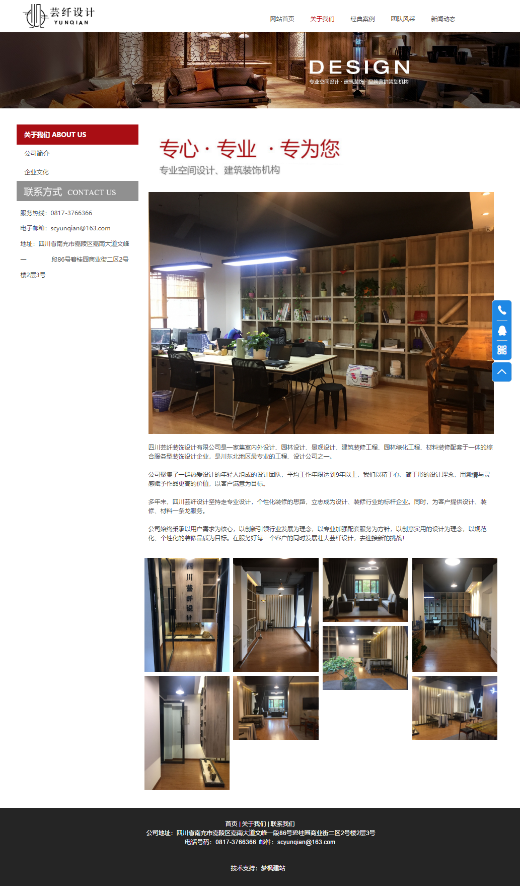 四川芸纤装饰设计有限公司是一家集室内外设计、园林设计、景观设计、建筑装修工程、园林绿化工程、材料装修配套于一体的综合服务型装饰设计企业,是川东北地区专业的工程、设计公司之一。