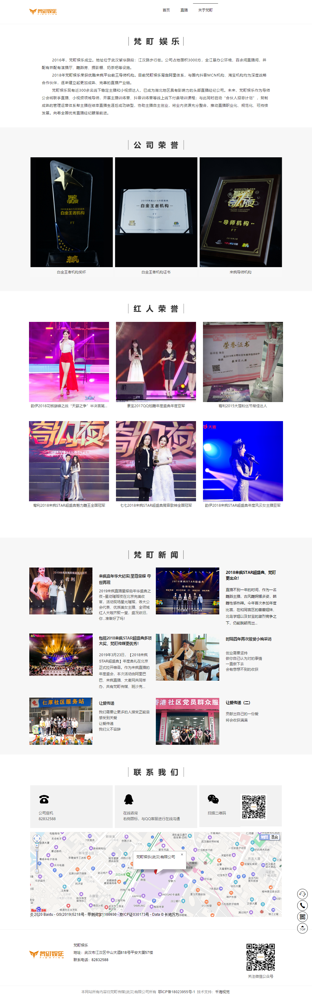 2016年,梵町娱乐成立。地址位于武汉繁华路劲:汉江路步行街。公司占地面积3000方,全江景办公环境,百余间直播间,并配有并配有演播厅、舞蹈房、摄影棚、奶茶吧等设施 2018年,梵町娱乐荣获优酷来疯平台前三导师机构。目前梵町娱乐背靠阿里体系,与国内抖音MCN机构、淘宝机构均为深度战略合作伙伴,逐渐建立起更加成熟、完善的直播产业链。