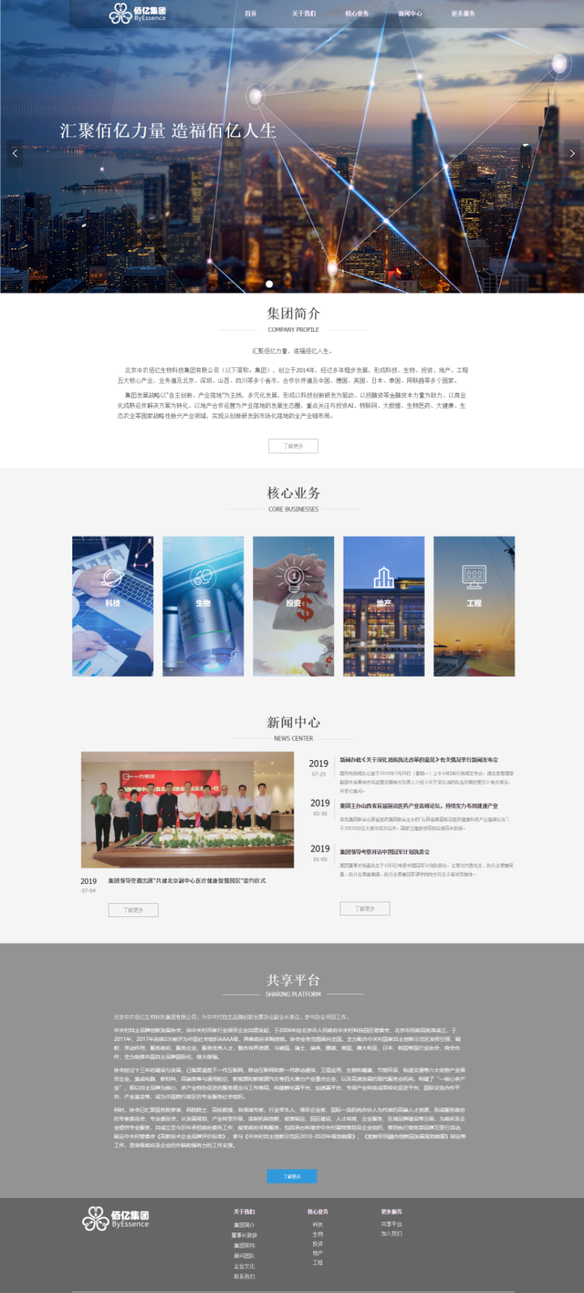 北京中农佰亿生物科技集团有限公司(以下简称:集团),创立于2014年,经过多年稳步发展,形成科技、生物、投资、地产、工程五大核心产业,业务遍及北京、深圳、山西、四川等多个省市,合作伙伴遍及中国、德国、英国、日本、泰国、阿联酋等多个。