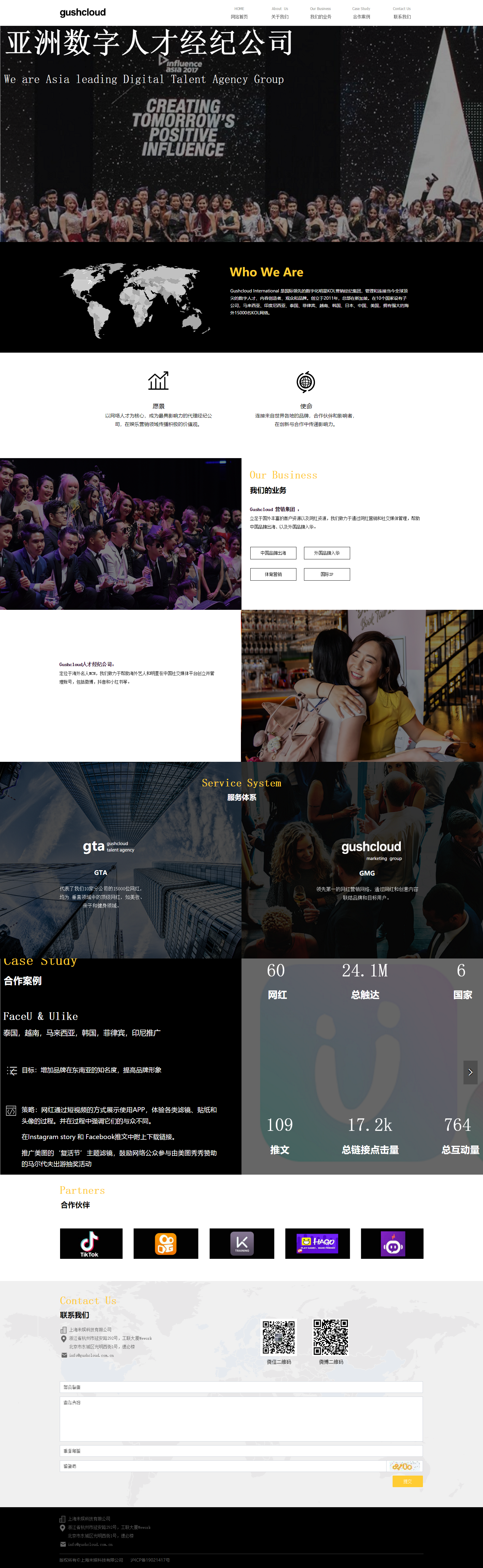 Gushcloud International 是国际领先的数字化明星KOL营销经纪集团,管理和连接当今全球的数字人才、内容创造者、观众和品牌。创立于2011年,总部在新加坡。在10个设有子公司,马来西亚、印度尼西亚、泰国、菲律宾、越南、韩国、日本、中国、美国,拥有强大的海外15000名KOL网络。