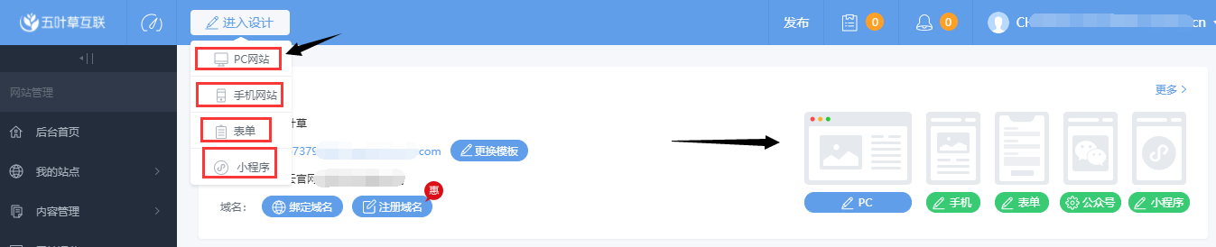 4、可以通过后台首页进入设计来进入对应的设计页面