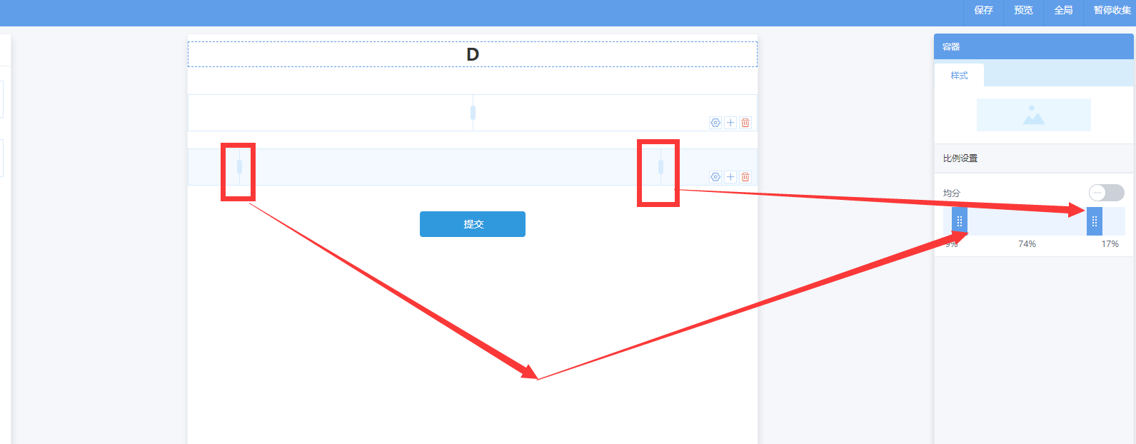 开启均分以后容器的分栏会按照等比平均分布,关闭以后可以拖动小条来自定义分栏