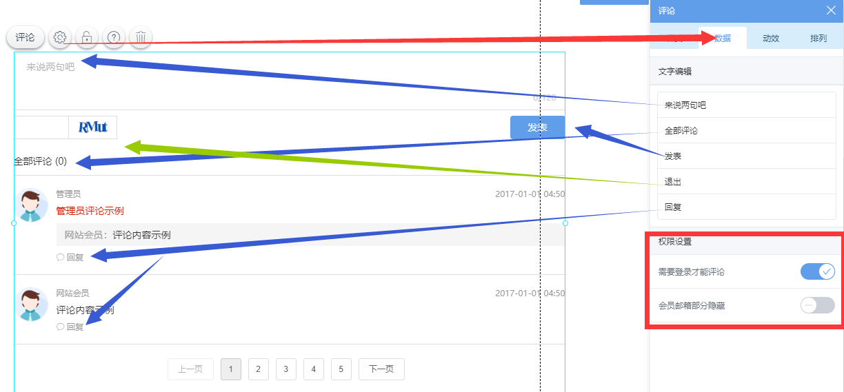 可以修改对应输入框及按钮的提示语,评论组件甚至可以设置登录后才能评论。