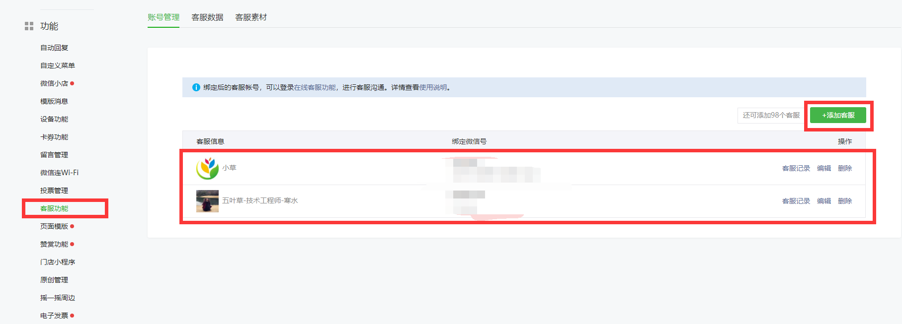 点击客服功能添加客服,等对应