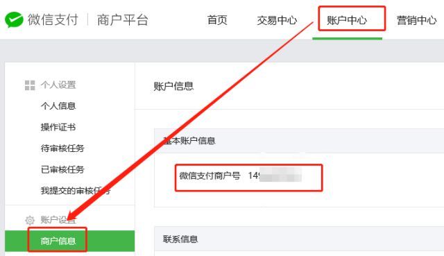1、登录商户平台选择账户中心点击商户信息,即可查看微信支付商户号