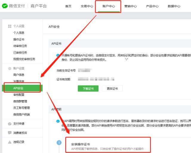 密钥生成后不会在微信后台明文展示,请自行保存以备后面授权其他支付时使用,如果微信支付平台更改密钥,更改成功后一定要重新下载证书,并在各大平台更新微信支付设置,否则会影响正常支付,将设置好的密钥粘贴到亿客达小程序设置(商户key)中。