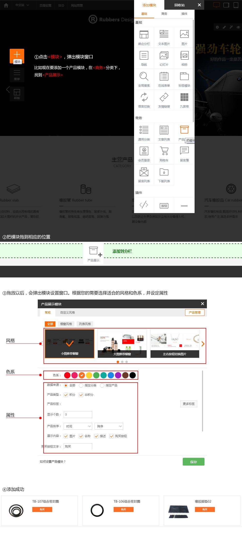 安装好模版以后进入网站编辑前台——左侧模块——鼠标点住对应模块——拖动到编辑页面对应位置——松手即可