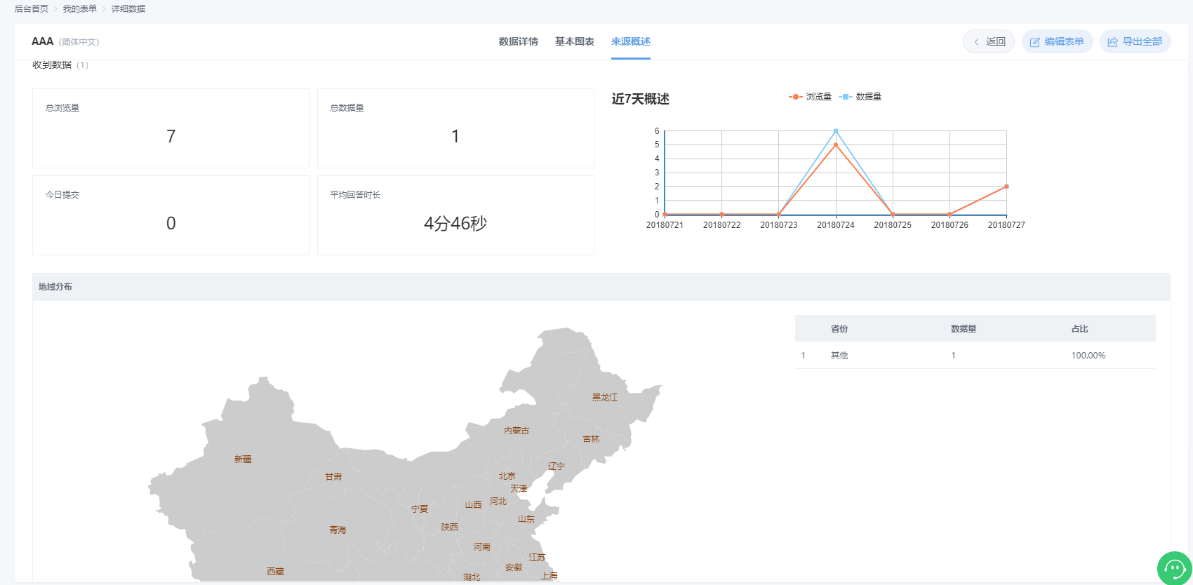 来源概述可以看到有当前表单的浏览、回答、平均回答时间的统计。而且可以看到是来自哪个地方的用户填充的表单。