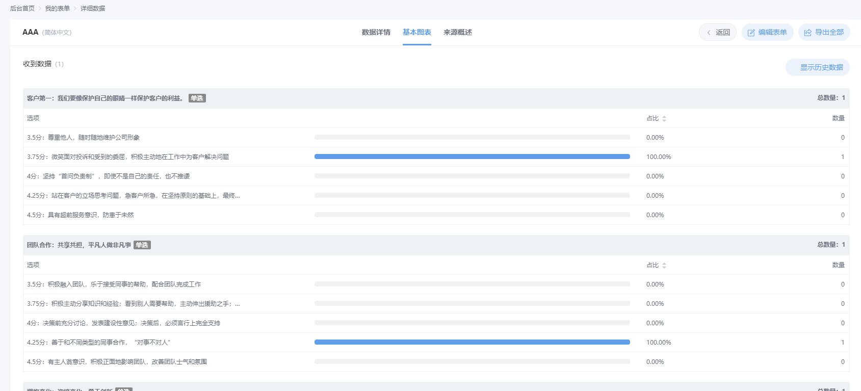 每一道选项题的详细概览,每个选项的占比和回答人数详细的标注出来。
