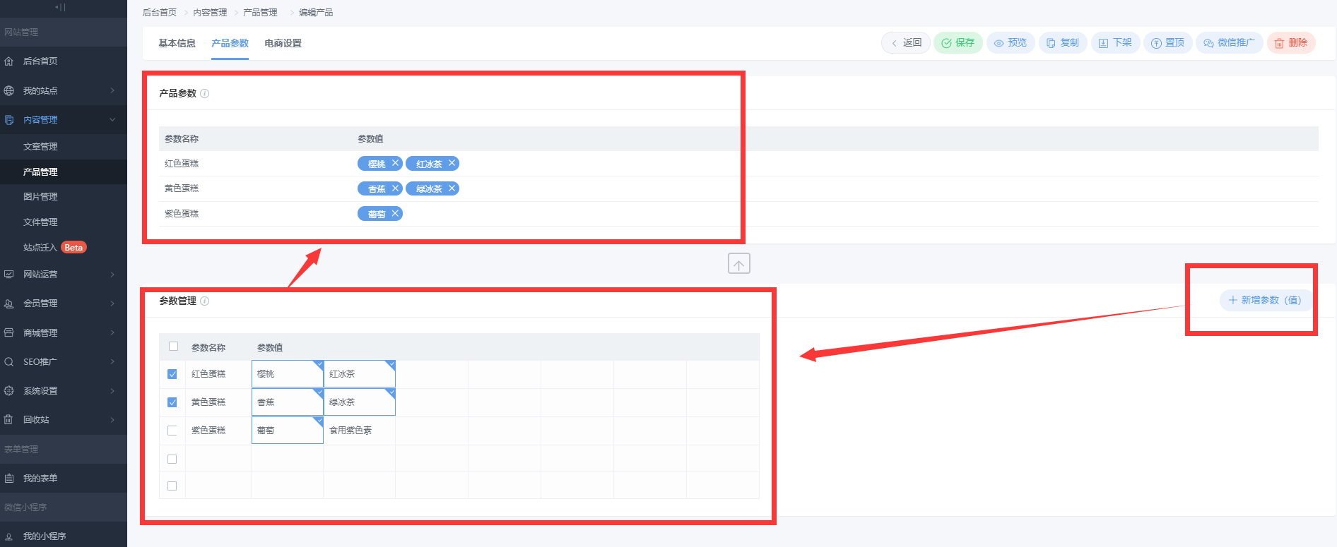 ①得先给产品添加具体参数,个填的是参数名称,第二个填的是参数值如有多个参数值可点击继续增加参数。