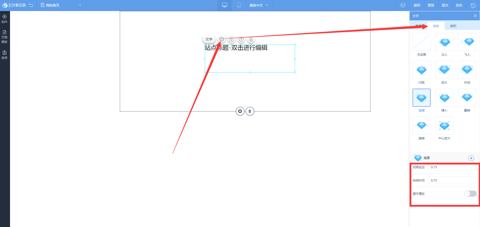 然后会显示我们现在所拥有的组件动画效果,然后选择其中一个动画效果设置栏下面会出现这个效果的具体属性设置。