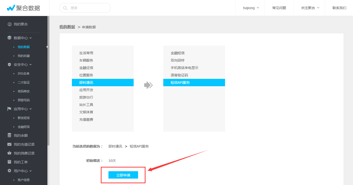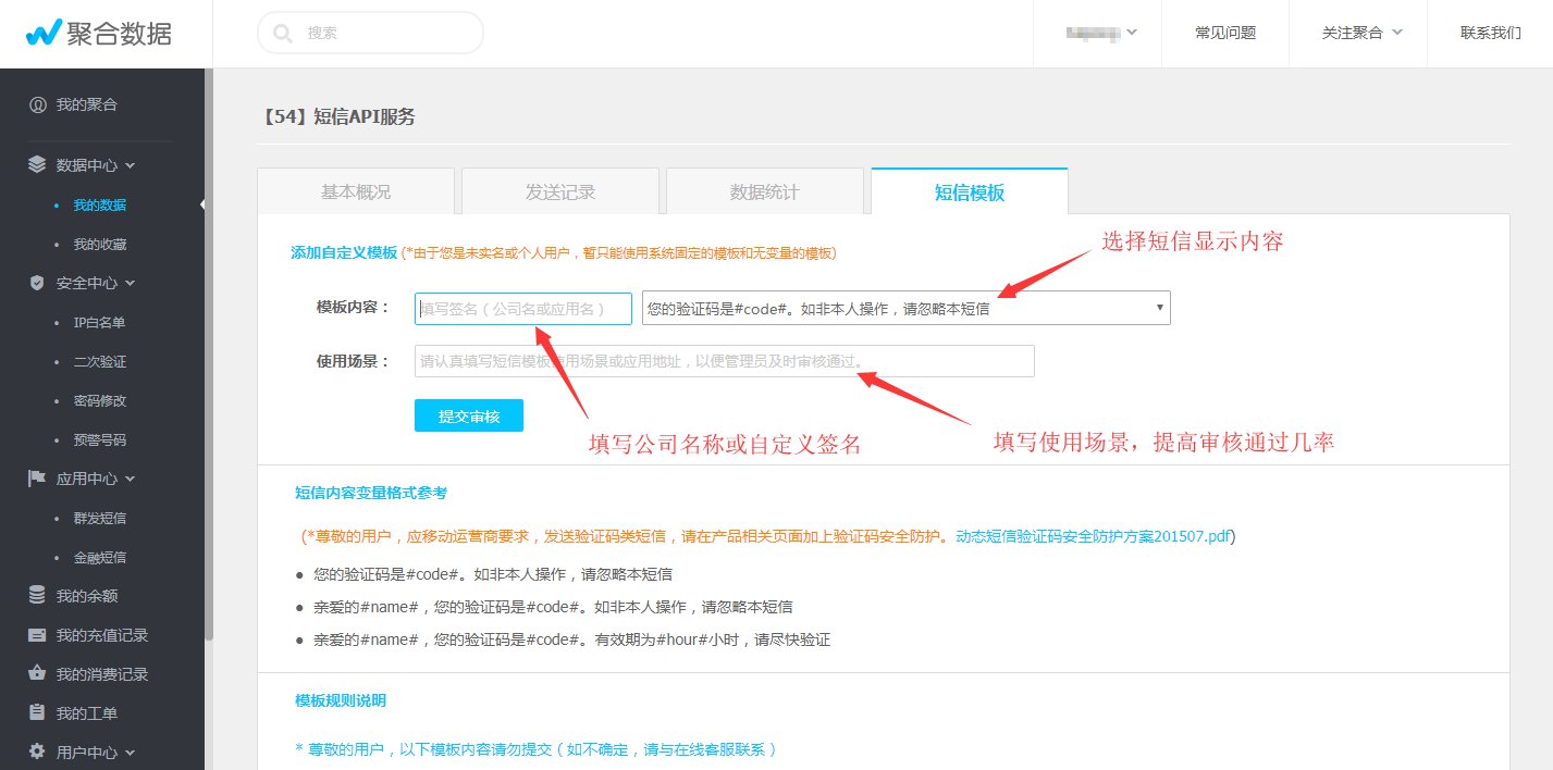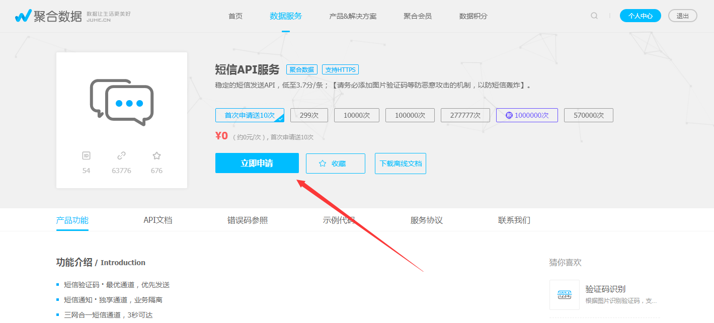 第二步、登录后,申请短信API服务 链接地址: www.juhe.cn/docs/api/id/54