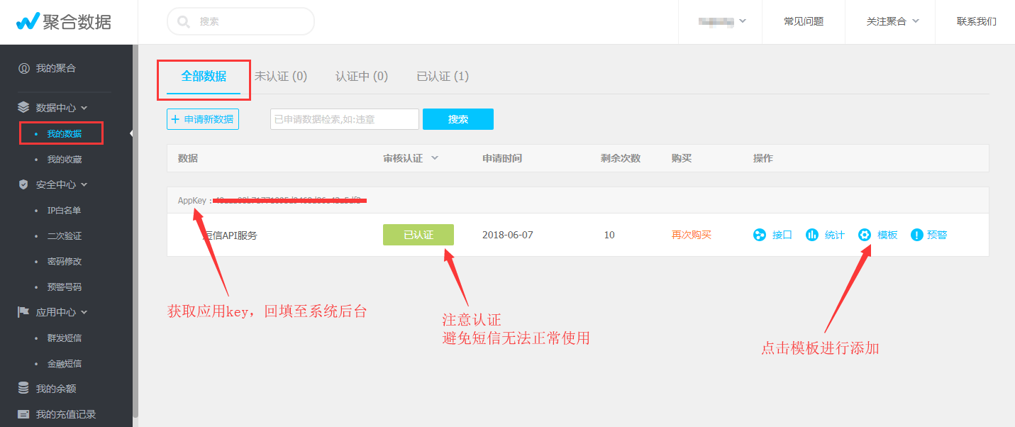 第三步、完成认证,添加短信模板