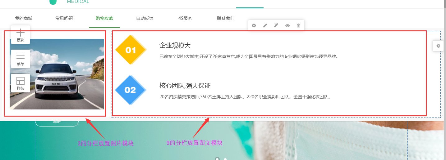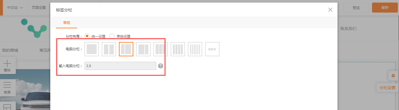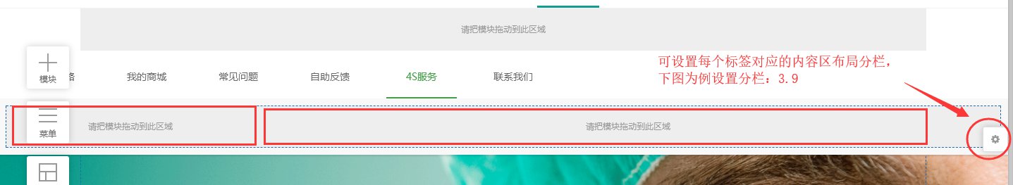 设置4S服务下方内容区为例,鼠标移到下面内容区的右侧齿轮,设置分栏为3.9布局。布局可按实际需求设置