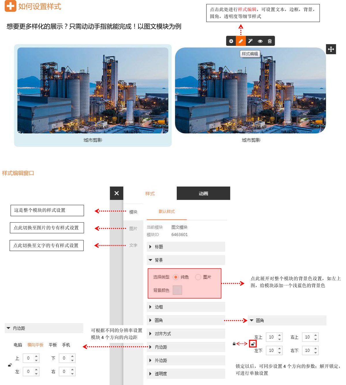 2.样式编辑:模块高级设置选项(调整内边距、外边距、背景、边框等)