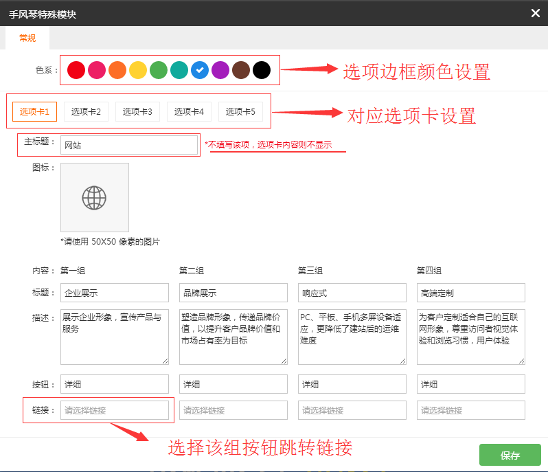 答:把选项卡的标题空白不填就不会显示该选项卡,建议是3-5个,否则没有手风琴效果