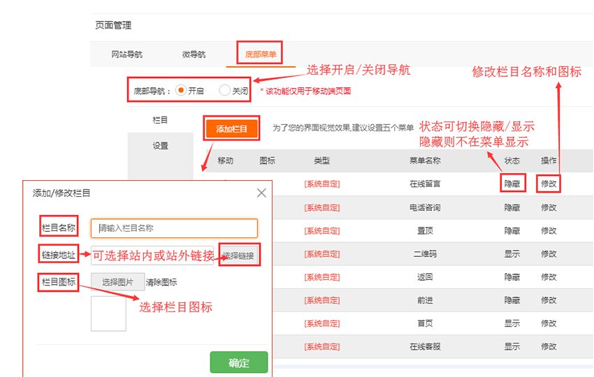 2)进入页面管理——选择底部菜单——编辑:可开启/关闭底部导航、可添加栏目、修改导航状态(隐藏/显示)、修改栏目名称和图标:
