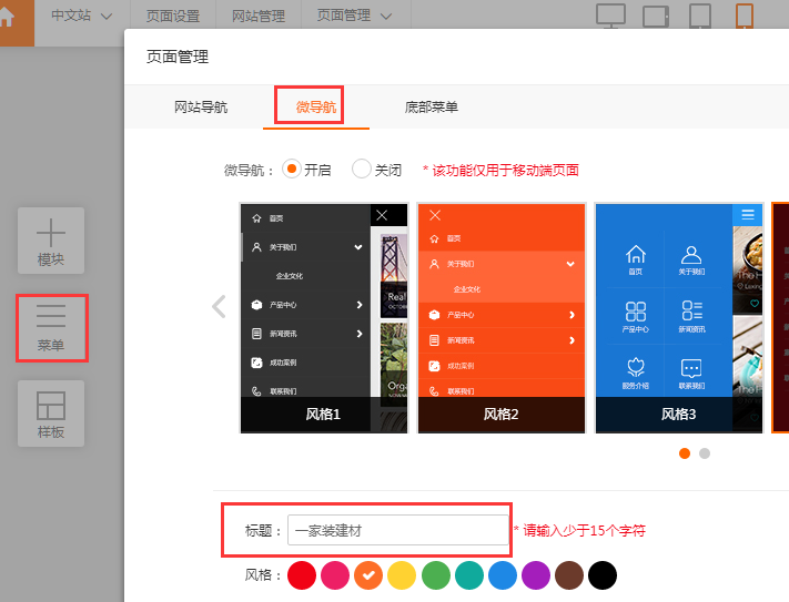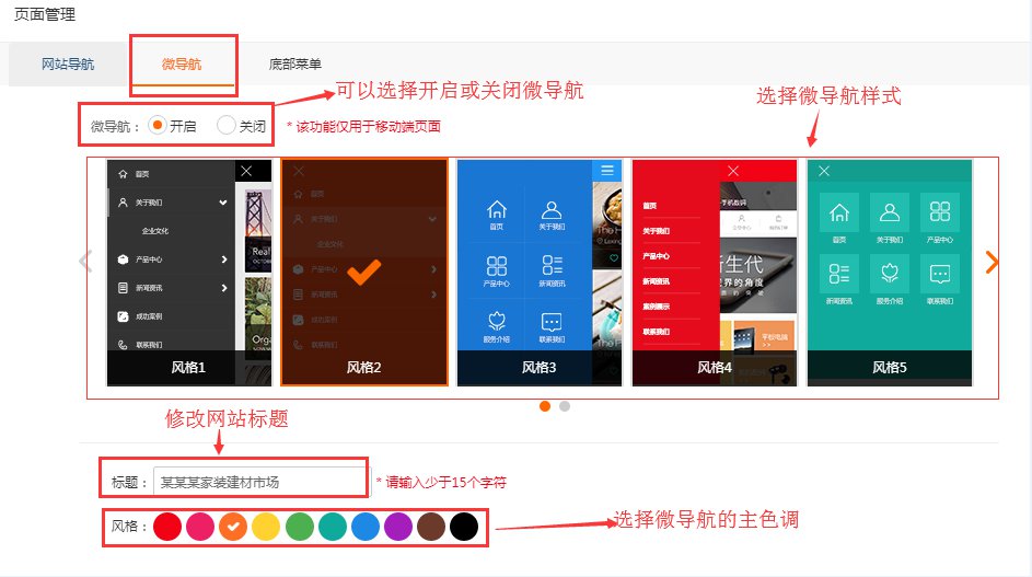 2)进入页面管理——选择微导航——编辑:可开启/关闭微导航、选择微导航样式、修改标题、微择微导航主色调: