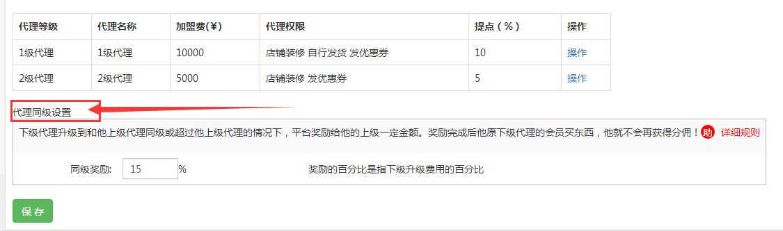 例如:用户A是一级代理,用户B是A的下级会员,B是二级代理,二级代理升级到一级代理需要支付加盟费1000元,平台设置的同级奖励:15%,那么当B升级到一级代理时,A代理可以获取奖励:1000*15%=150元。(注:当B会员升级到一级代理后,B和A就是同等级会员,同等级会员之间是没有代理差价,那么B及B的下级会员购买产品后,A都不会有佣金提成了。详细规则请点击下图右侧“助”)