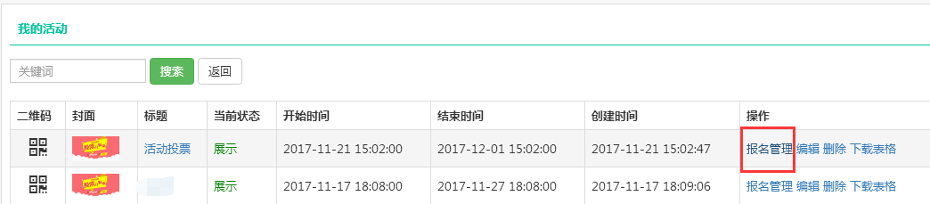 搜索到活动,点击报名管理