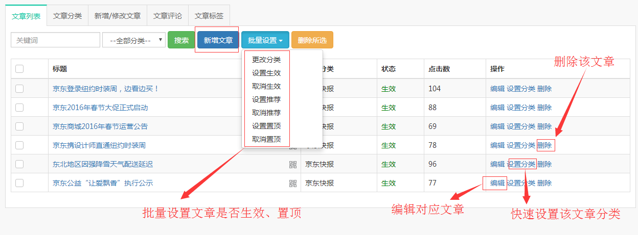 新增/修改文章、批量设置文章分类;文章推荐等功能