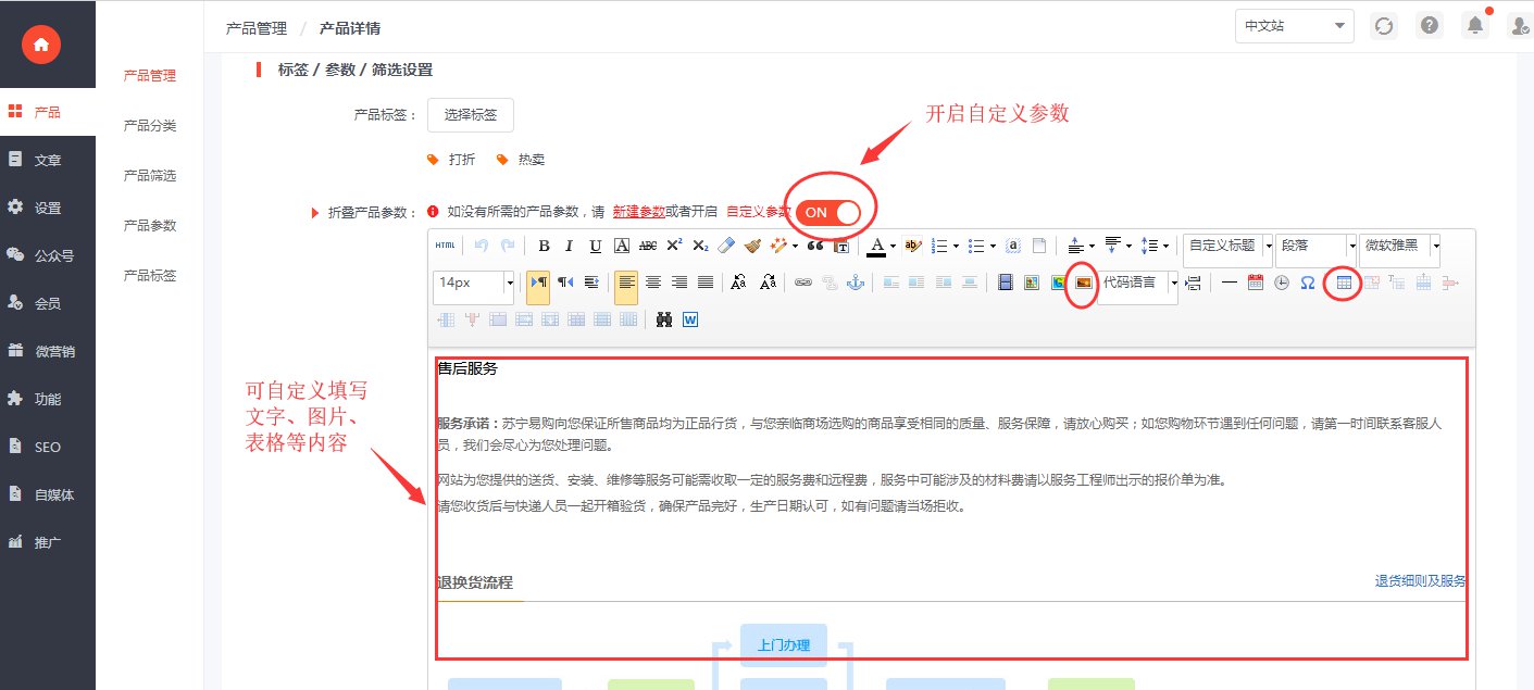 2.标签/参数/筛选设置栏—ON打开自定义参数选项—并在下方编辑器任意填写图文或上传图片后,保存即可