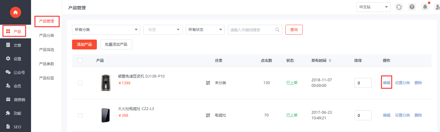 1.操作路径:进入网站后台—产品—产品的编辑