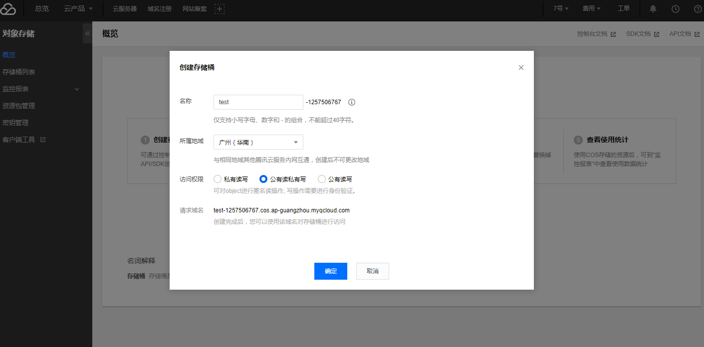 5.自定义填写名称,选择所属地域,及访问权限,确定保存