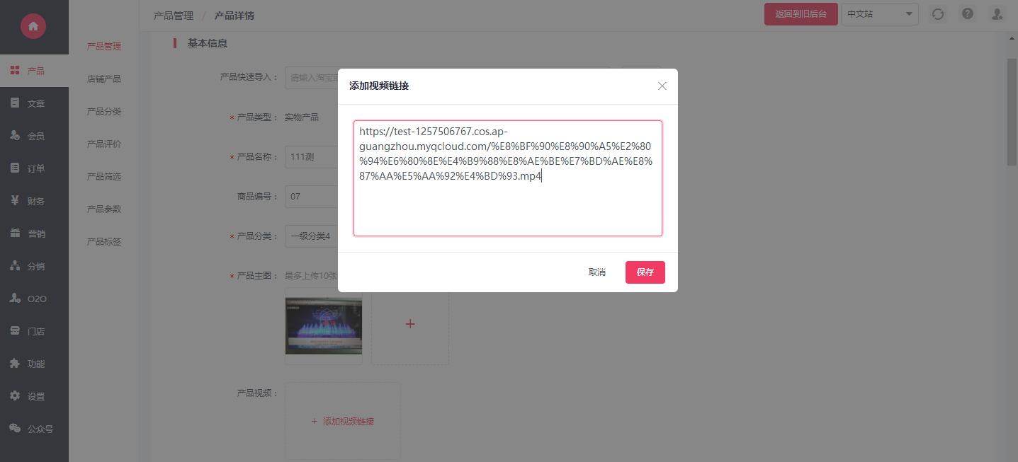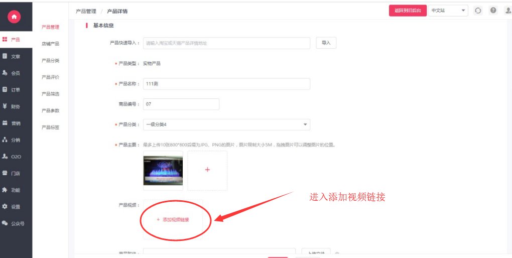 8.进入我司后台——产品——添加产品——点击添加产品视频——粘贴视频链接地址——保存——补全产品其它参数——保存即可。