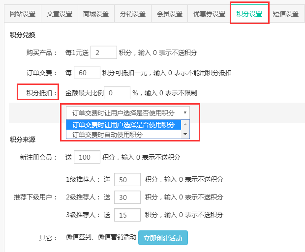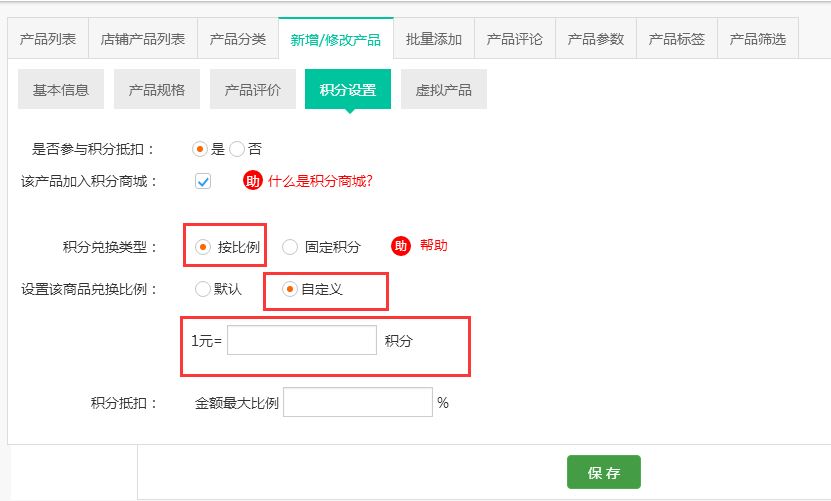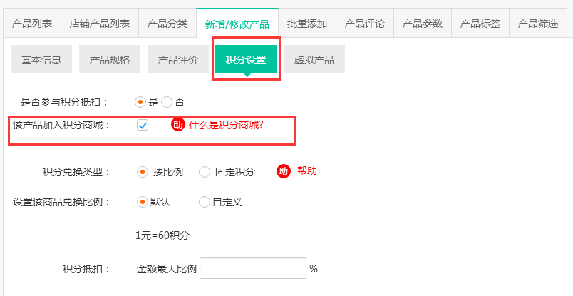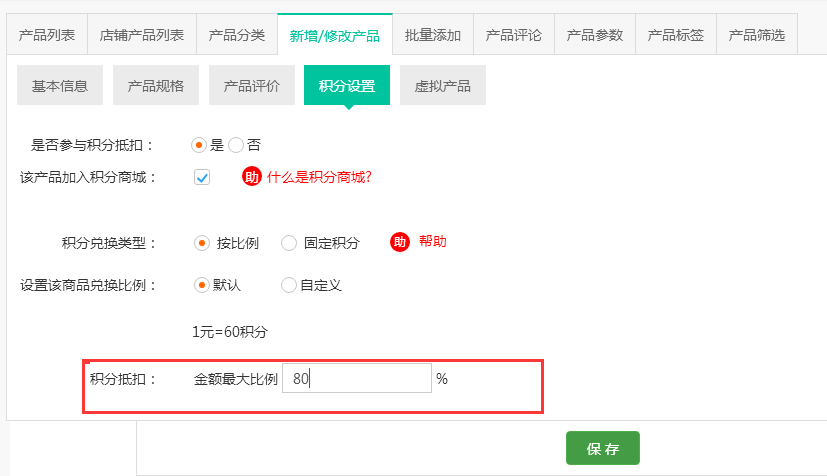 2.设置积分抵扣:金额比例:这里设置后,可以限制客户此产品多能抵扣的比例。