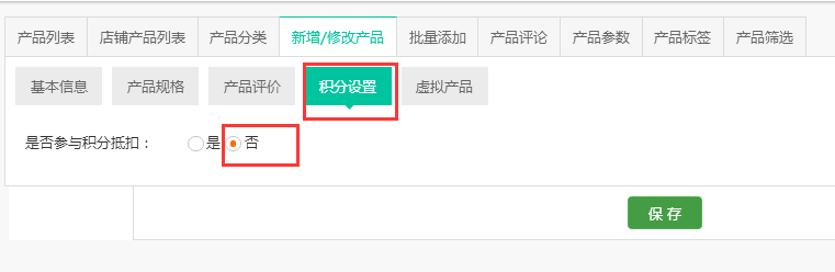 2.单个产品关闭积分抵扣功能的设置:登录后台——产品——单个产品编辑详情页面——积分设置——选择“否”即可。