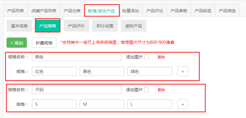 1、登陆系统后台——产品——添加产品——产品规格,可设置规格名称和规格。如图