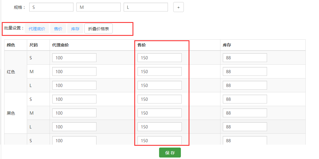 2、设置好规格后,可以针对所有规格批量设置成本价(代理低价)、售价、库存,也可以单独修改成本价(代理低价)、售价、库存。