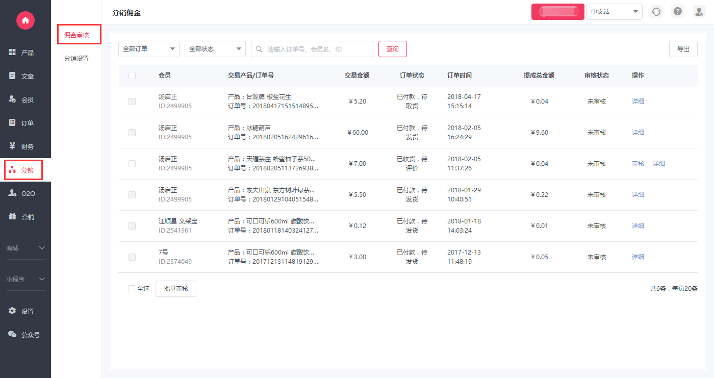 1、登陆系统后台——分销——分销提成审核