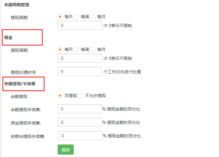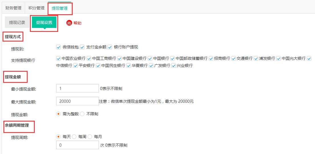 提现设置:可设置提现方式、提现金额、余额提现周期、佣金提现、余额提现手续费等提现规则。