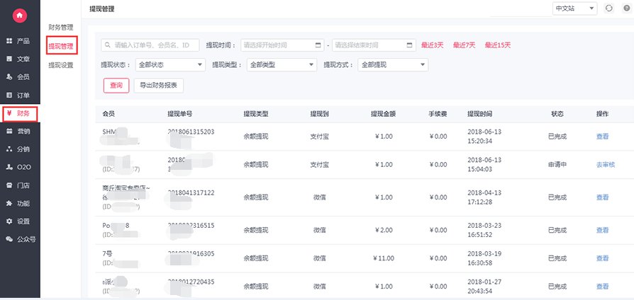 财务管理是商城必备功能之一,专门记录每一笔提现资金的动向。