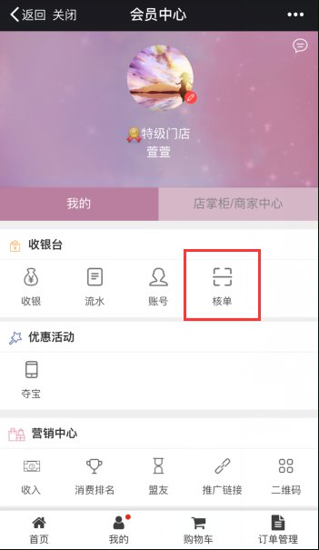 2.到店审核操作流程:登录手机端会员中心——收银台“核单”可以扫一扫客户提供的取货码核单,也可以输入客户提供的取货号核单。