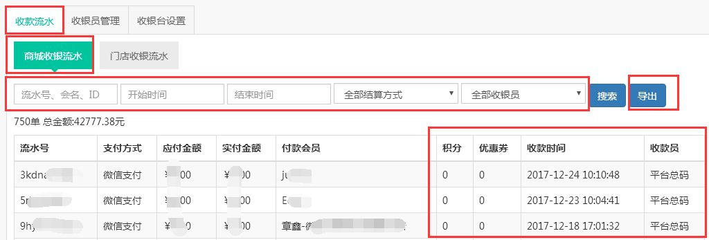 1.登录系统后台——收银台——收款流水——商城收银流水