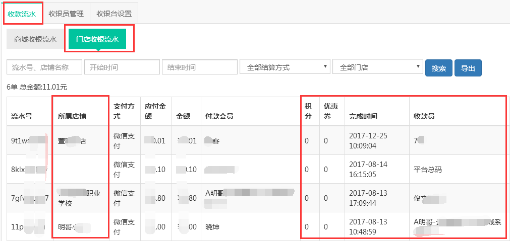 1.登录系统后台——收银台——收款流水——门店收银流水